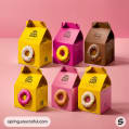 Stacked donut boxes with vibrant pink and yellow designs, featuring images of assorted donuts with sprinkles.