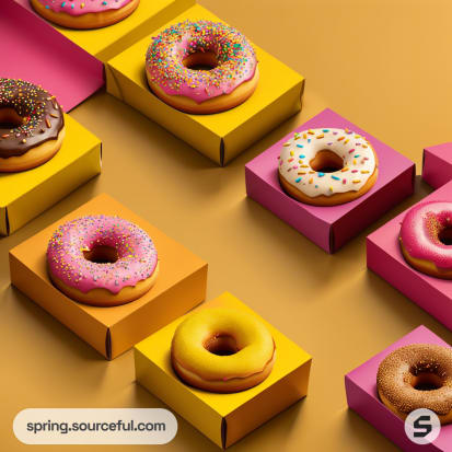 Pink and yellow donut box packaging with colorful sprinkles on a gradient background.
