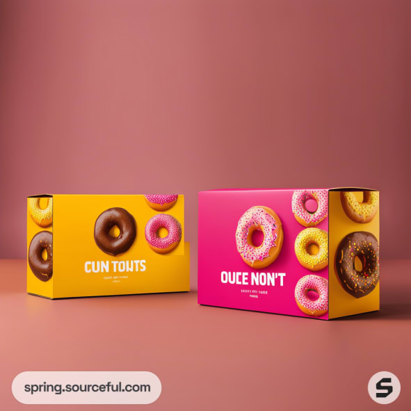 Two colorful donut-themed boxes on a pink background, one yellow and one pink, featuring images of donuts.