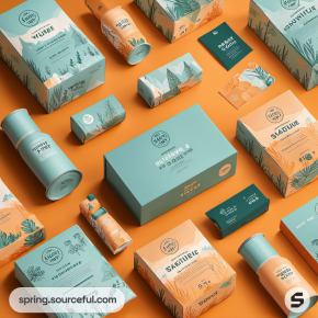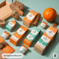 Assorted orange and teal boxes and tubes with nature patterns on an orange surface.