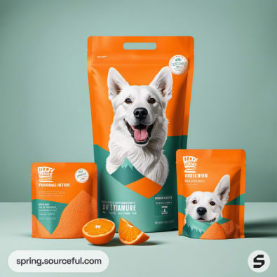Collection of orange and teal packages with dog graphics, an orange fruit nearby.