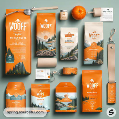 Selection of orange pet care products with mountain scenery graphics on green background.
