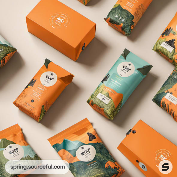 Orange and green pet food packages with nature-themed designs on a beige surface.