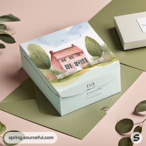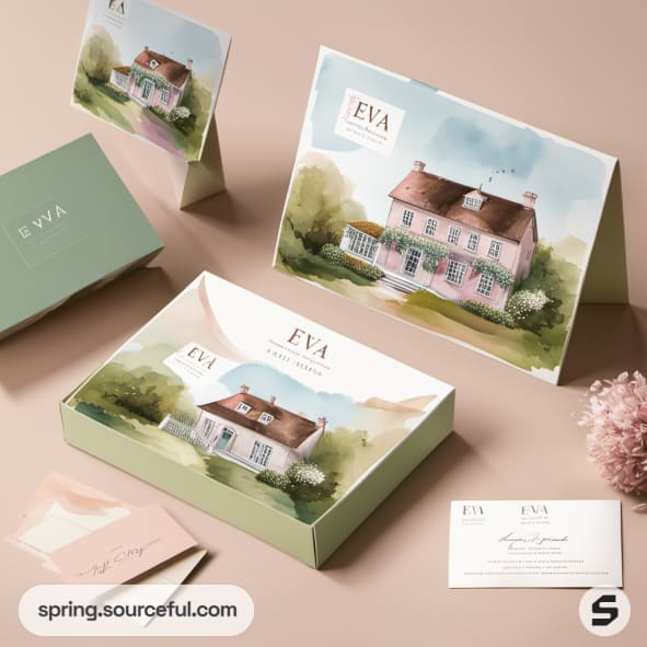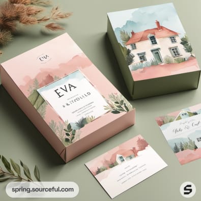 Pink and green boxes with watercolor house illustrations, accompanied by cards and foliage.