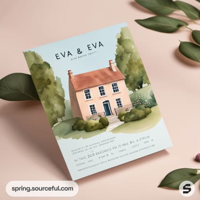 Invitation with a painted house and greenery on a pastel background.