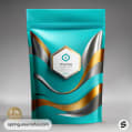 Teal resealable pouch with wavy gold and silver design, featuring a hexagonal white label.