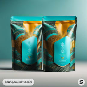 Teal and gold resealable pouches with a swirl design on a teal background.