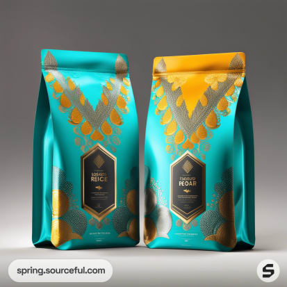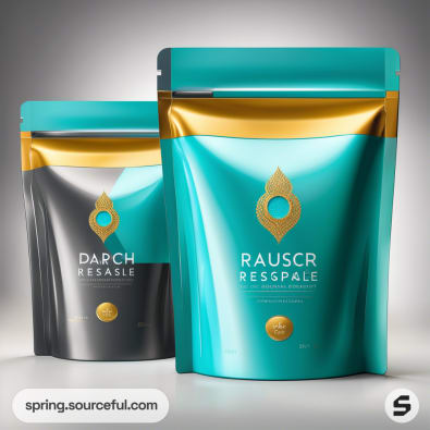 Resealable pouches with teal and gold geometric design on a gradient background.