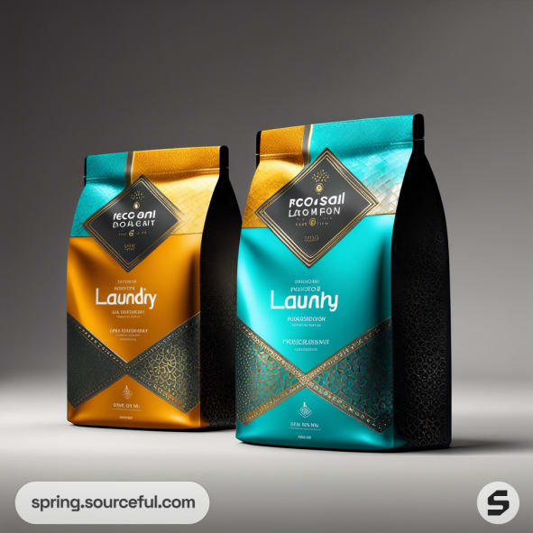 Two colorful resealable pouches for laundry detergent, one gold and black, the other teal and black, with geometric designs.