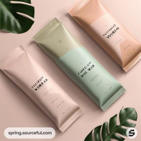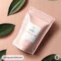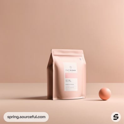 White and peach stand-up pouch on a beige surface.