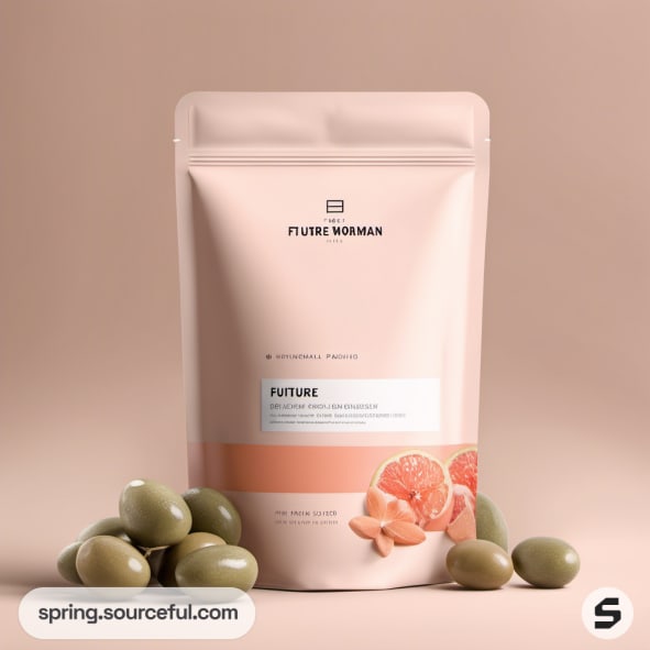 Pink stand-up pouch with grapefruit and olives on beige background.