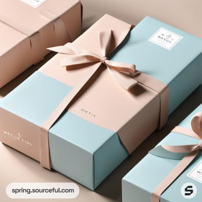 Elegant gift boxes with pastel pink and blue wrapping, tied with satin ribbons, on a beige surface.