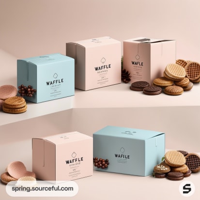 Two rectangular boxes in pastel pink and blue with assorted waffles and cookies displayed around them.