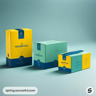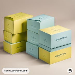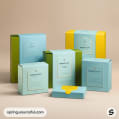Opened pastel yellow and blue boxes with product cards inside.