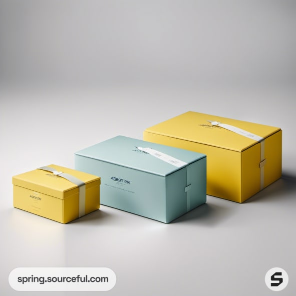 Yellow and blue boxes with ribbon, various sizes.
