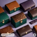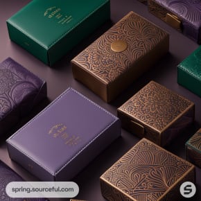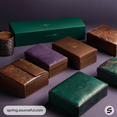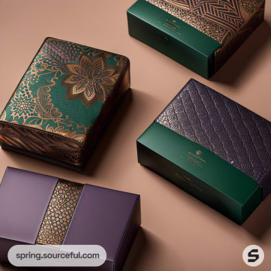 Luxurious boxes in brown, purple, and green with embossed patterns and a dark green elongated box in the background.