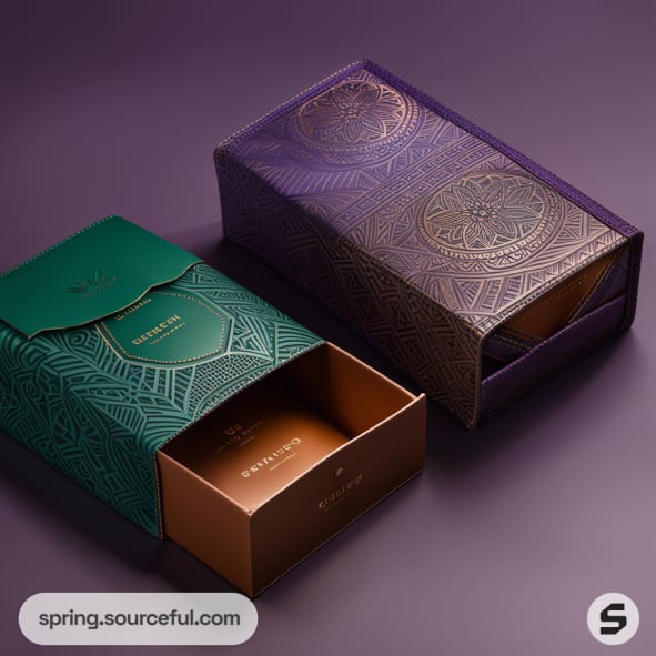 Two intricately embossed sliding drawer boxes, one green and one purple, both with geometric patterns.