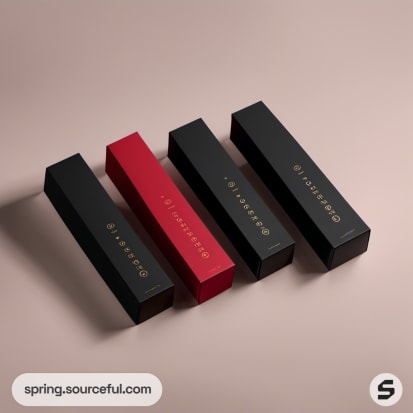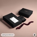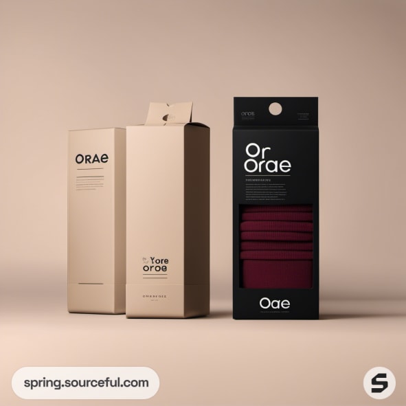 Stacked boxes with a maroon textile piece, featuring minimalist design.