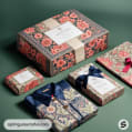 Floral gift boxes with intricate red and green patterns.