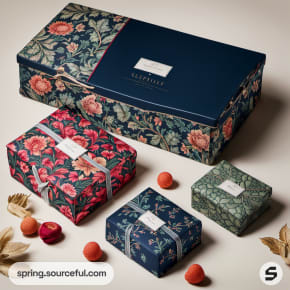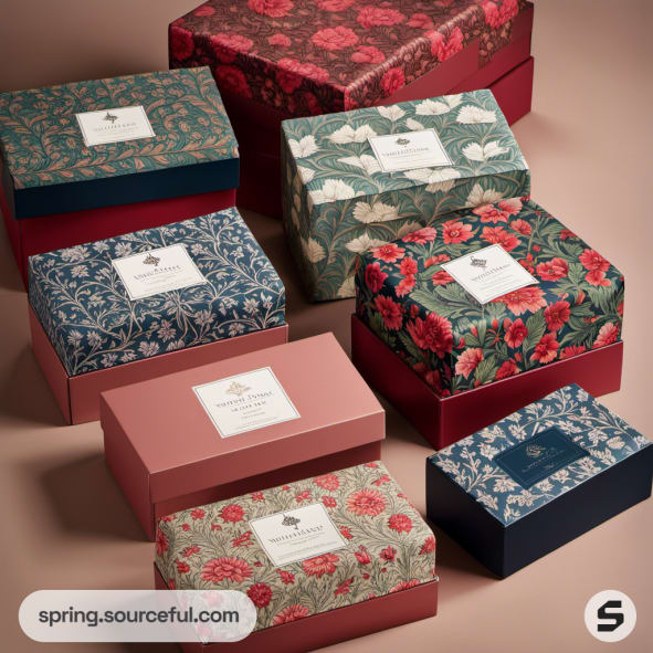 Various floral patterned gift boxes with elegant designs.