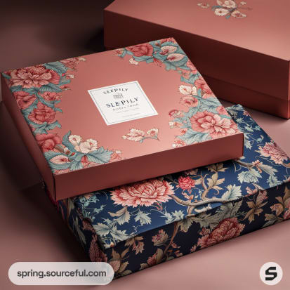 Assorted floral patterned boxes with one open to show inner print.
