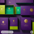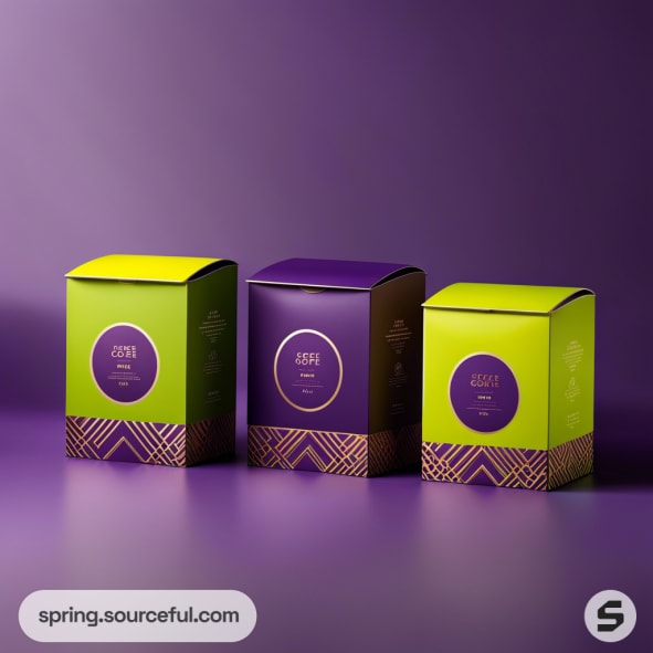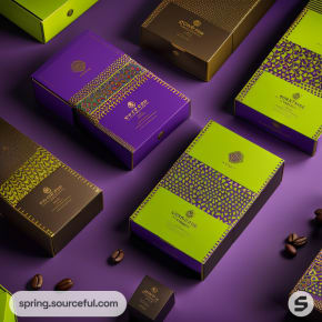 Elegant coffee packaging in sleek boxes with purple, green, and black colors and geometric gold accents.