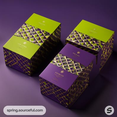 Purple and green luxury gift boxes with gold geometric patterns, arranged on a purple surface.