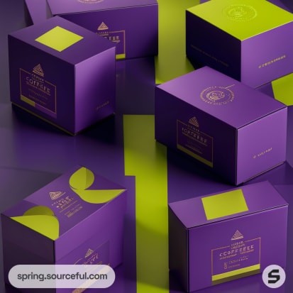 Purple and green cardboard boxes with coffee labels on glossy surface.