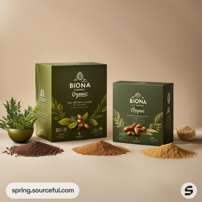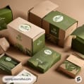 Green and beige boxes with organic branding