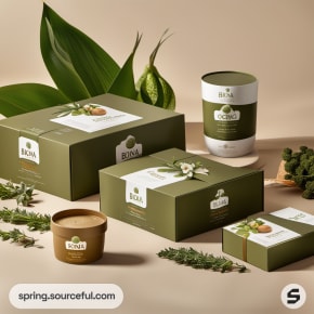 Green and beige product boxes with botanical elements