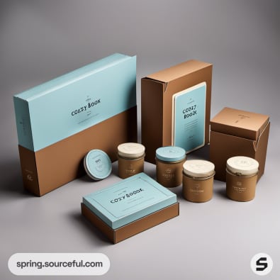 Coffee and book-themed packaging in brown and blue tones with jars and a large box.