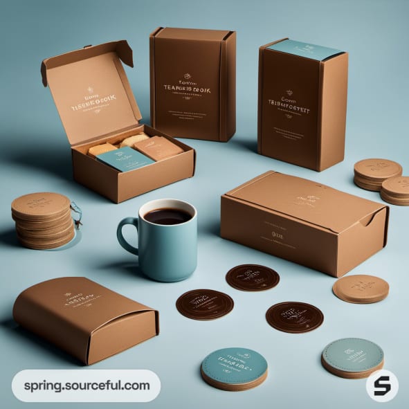Brown and blue coffee-themed gift boxes with coasters and a mug on a blue background.