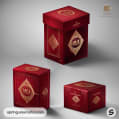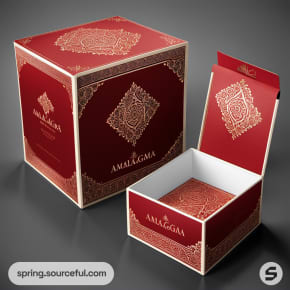 Elegant red and gold cube packaging box with decorative patterns.