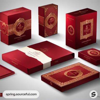 Variety of red packaging with gold designs, arranged stylishly.
