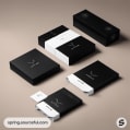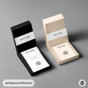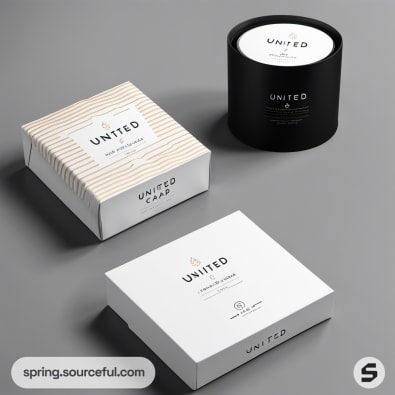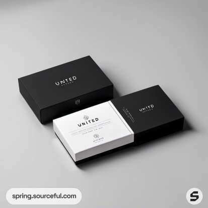 Black and white rectangular boxes with minimalist design on a beige surface.