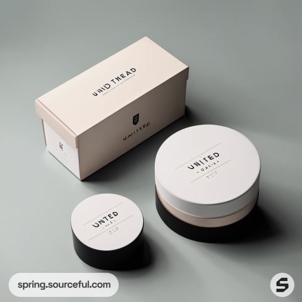 Beige and black cylindrical and rectangular packaging on a light surface.