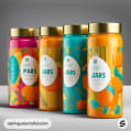 Four cylindrical jars with tropical-themed labels in orange, teal, and yellow with screw-on lids.