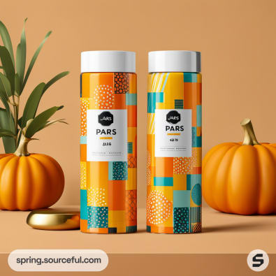 Two bottles with colorful geometric patterns on a beige background with pumpkins and plants.