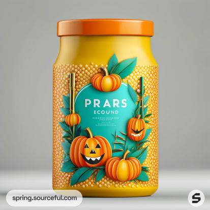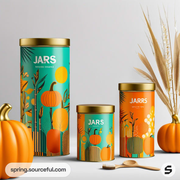 Cylindrical containers with pumpkin-themed design in teal and orange with gold lids.