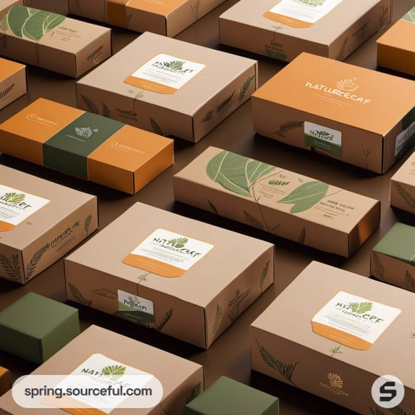 Eco-friendly boxes with green and orange leaf designs on kraft paper.