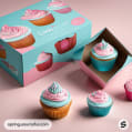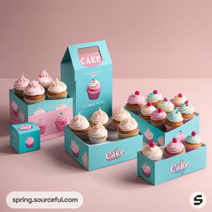 Cupcake packaging with pink and blue design, featuring a large cake illustration on mailer boxes.
