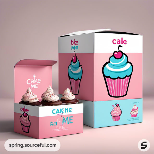 Pink and blue cupcake boxes labeled 'Cake Me' and 'Cake Out' with cupcake illustrations.
