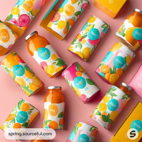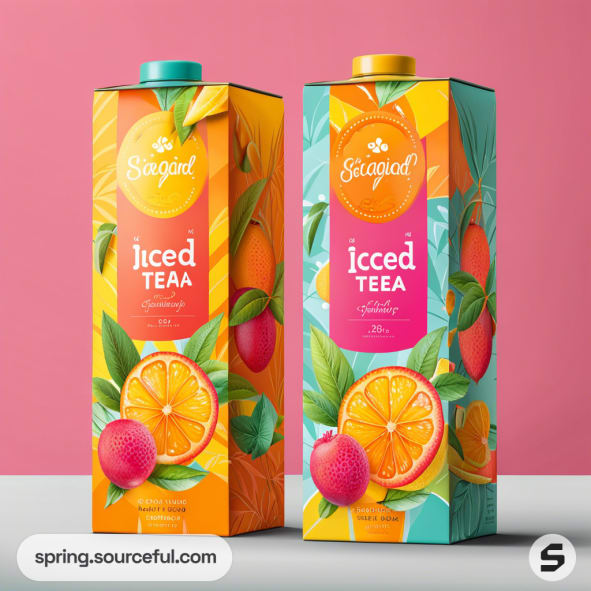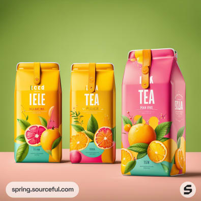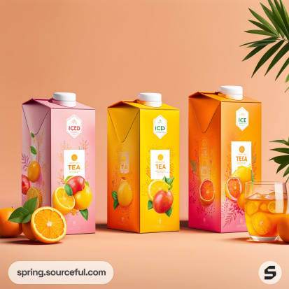 Discover the perfect packaging inspiration for your Summer flavoured iced tea with our vibrant and eye-catching designs. Our color scheme of pink, yellow, and orange perfectly encapsulates the happy, bright aesthetic of the season. The packaging is not just visually appealing but also designed to keep your iced tea fresh and flavorful. Make your product stand out on the shelves with our unique and creative packaging designs.