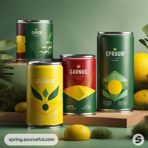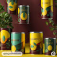 Various beverage cans with abstract designs in yellow, green, and orange.
