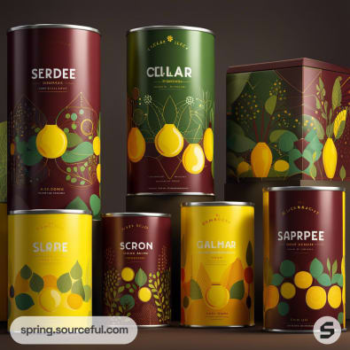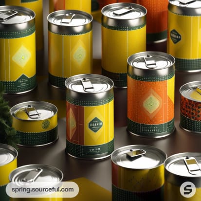 Multiple cans with circular patterns in yellow, green, and maroon.