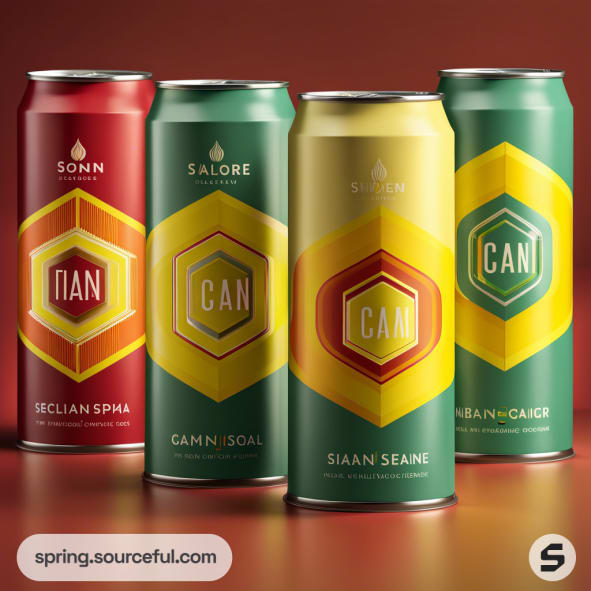 Tall cans with geometric patterns in yellow, red, and green on a red gradient background.