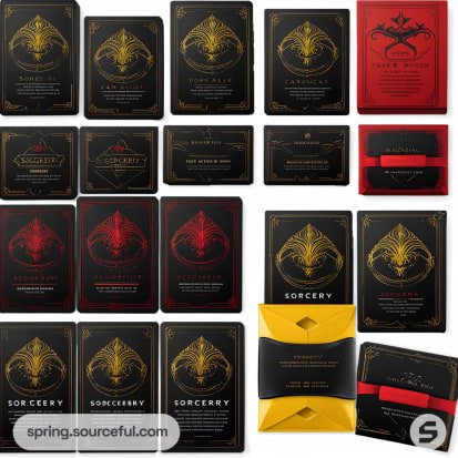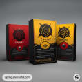 Collection of card game packages with ornate designs in red, gold, and black colors.