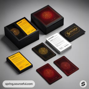Black and red card game boxes with cards, showing detailed instructions and designs.