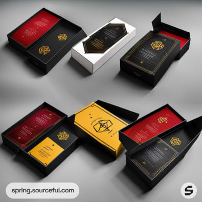 Card game boxes with red and yellow interiors showcasing designs and instructions.