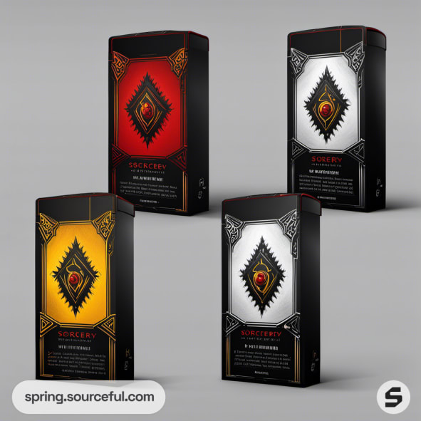 Four card game boxes with intricate designs in red, white, black, and yellow colors.